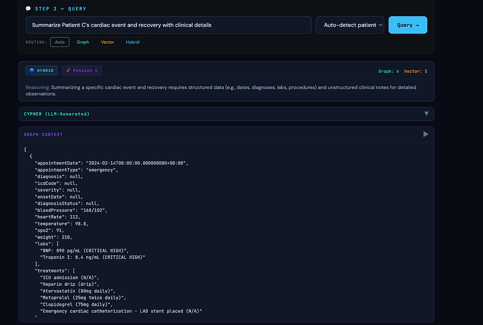 The combination of Neo4j for structural traversal, ChromaDB for semantic retrieval, and a language model that knows when to use each produced something qualitatively different from either approach alone. It can follow a patient's story from first presentation through years of clinical evolution and explain not just what happened but why.